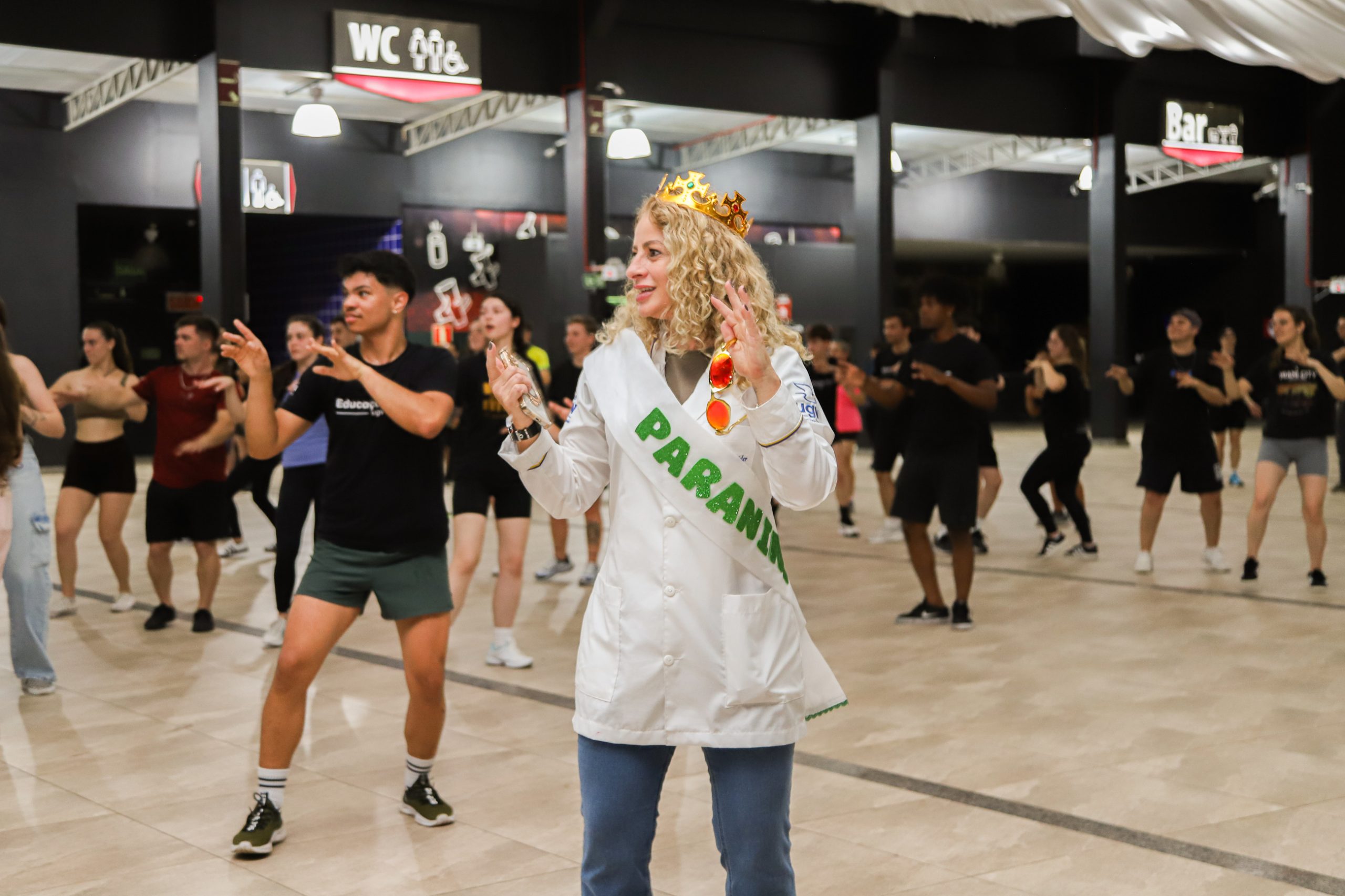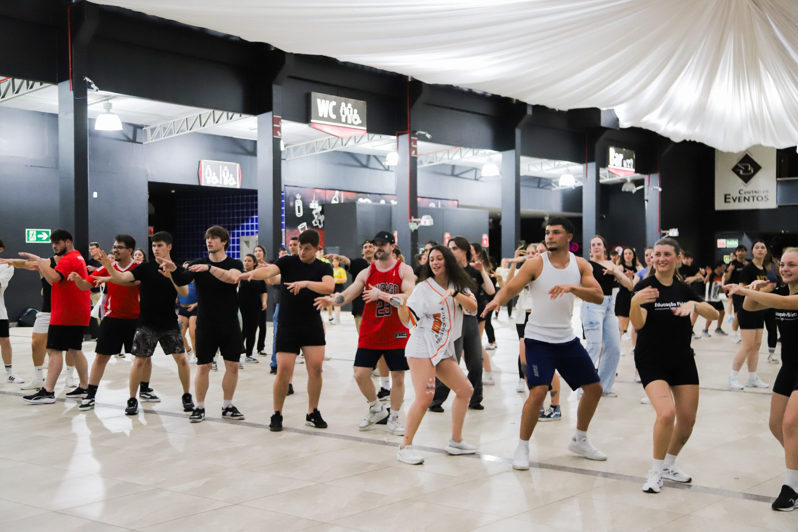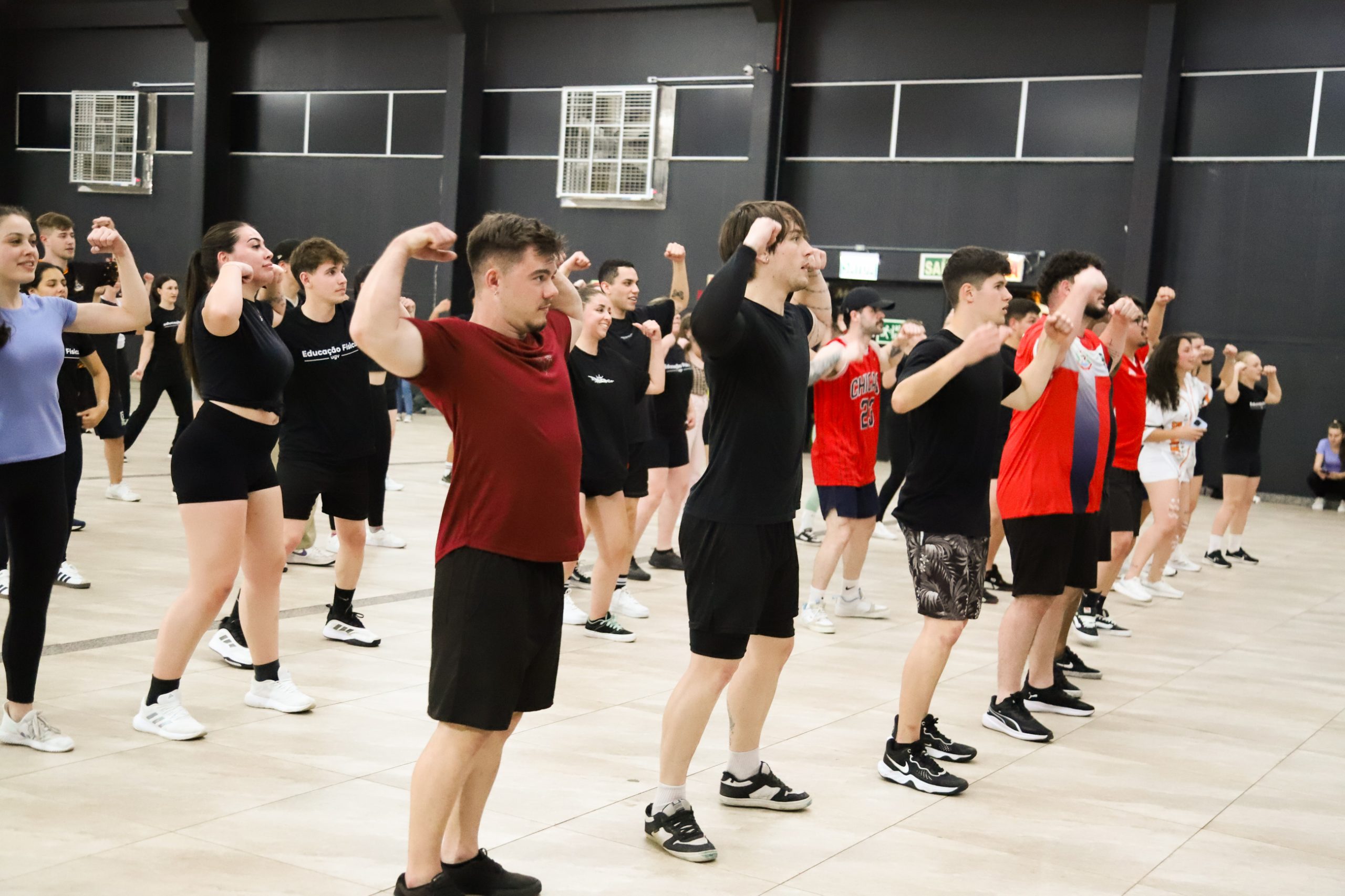Realizado no dia 5 de novembro, o 4º Aulão de Ginástica de Academia reuniu cerca de 90 participantes, entre acadêmicos e convidados, em uma animada atividade de dança na UGV. Conduzido com entusiasmo pelos alunos do 6º período de Educação Física, sob a orientação da professora Mayara Quelho, o evento foi recheado de descontração, integração e muito ritmo.