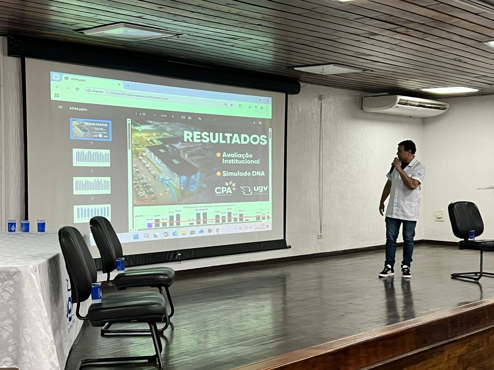 A noite também contou com a presença da pró-reitora acadêmica, professora Larissa Jagnez, e do coordenador do curso de Administração, professor Jonas Elias de Oliveira, que apresentou os resultados da Avaliação Institucional realizada pela CPA (Comissão Própria de Avaliação) no segundo semestre de 2025. Na ocasião, foi destacada a importância desse instrumento para a avaliação contínua da instituição e do corpo docente, reforçando o compromisso da UGV com a qualidade do ensino e a constante melhoria dos processos acadêmicos.