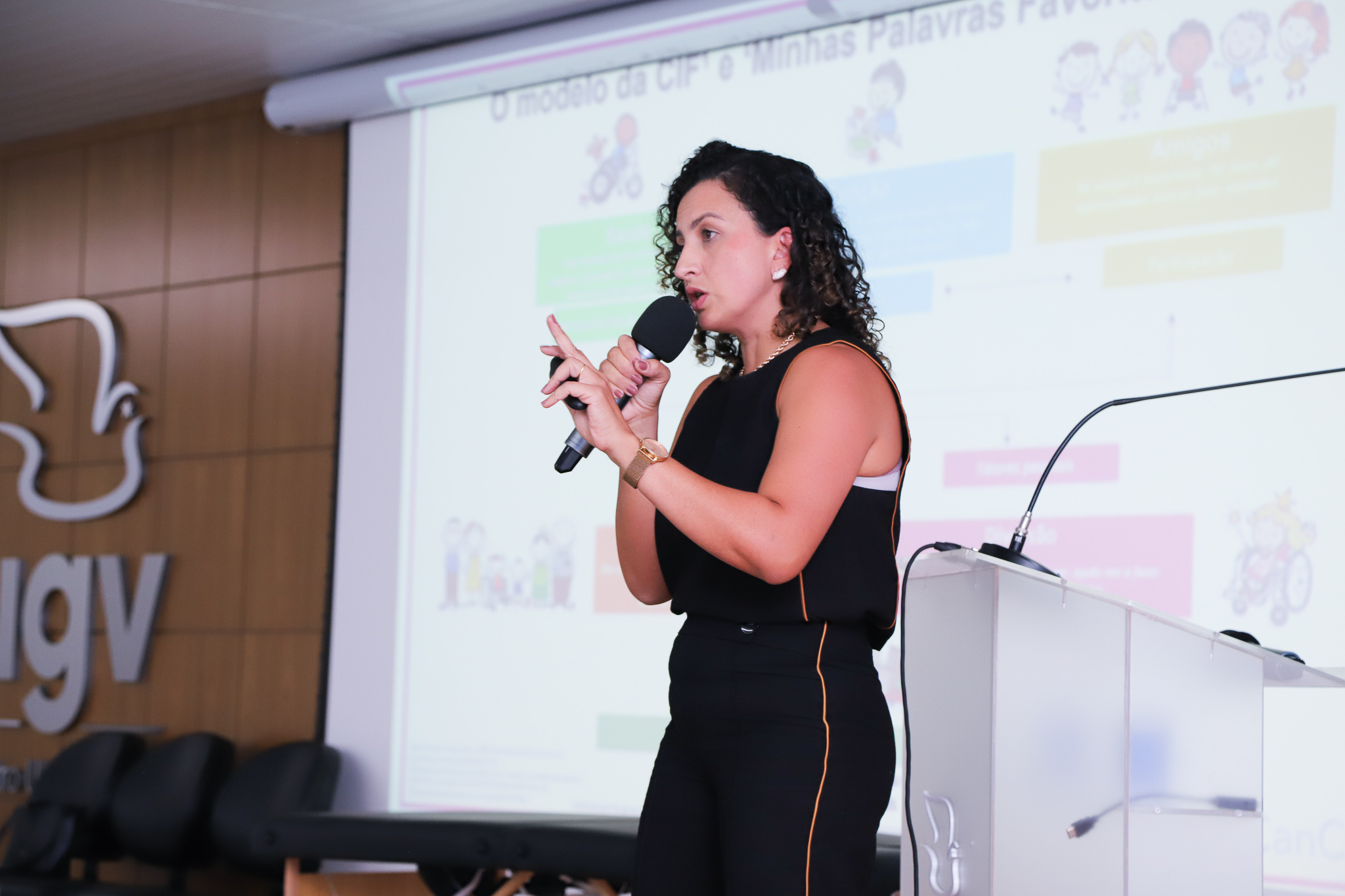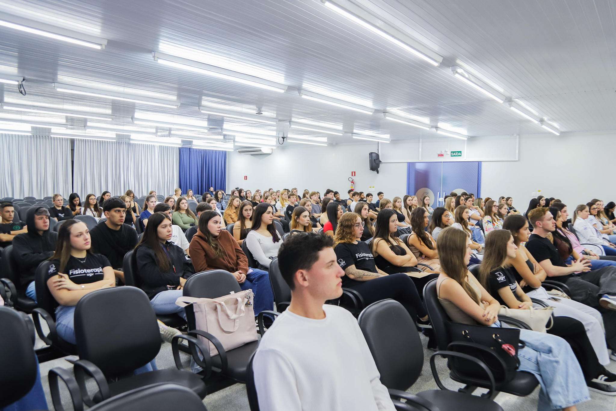 Na sequência, os estudantes acompanharam a palestra da fisioterapeuta Dra. Bárbara Graefling Flissak, egressa da instituição, que compartilhou sua trajetória profissional na área de neuropediatria. Durante sua fala, abordou o método de avaliação utilizado em sua prática clínica, evidenciando como os conhecimentos adquiridos na graduação se traduzem em atendimentos qualificados, humanizados e eficientes. Além dos aspectos técnicos, também trouxe reflexões sobre propósito, vocação e a importância da constante busca por evolução profissional.