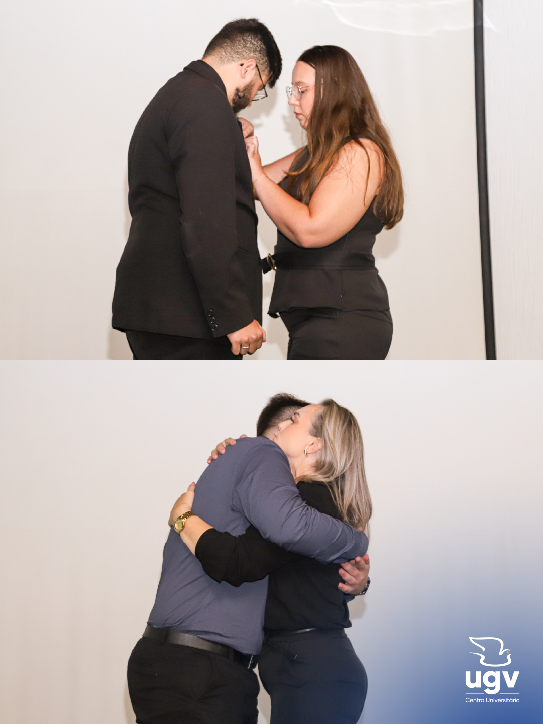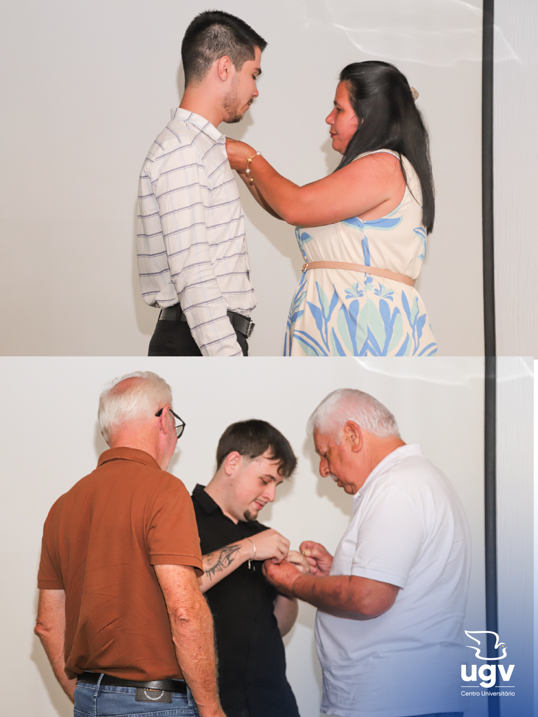 Um dos momentos mais emocionantes da noite foi a participação de familiares e pessoas especiais escolhidas pelos acadêmicos, responsáveis por realizar a colocação do pin, simbolizando o apoio e o reconhecimento pela trajetória construída ao longo da graduação.