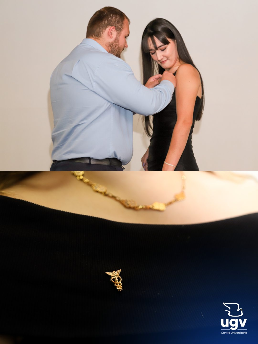 Durante o evento, os acadêmicos receberam um pin com o símbolo do caduceu, que passa a representar essa etapa da caminhada acadêmica. O momento também marca a transição para uma fase de maior aproximação com a prática profissional, quando os estudantes passam a intensificar a participação em atividades de extensão, estágios e experiências externas, ampliando o contato com a realidade da profissão.