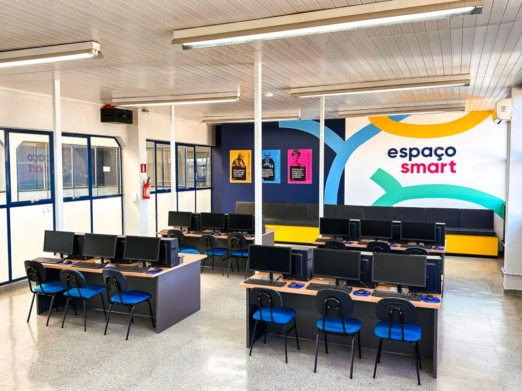 E onde era o antigo espaço Smart, virou a expansão do laboratório de informática 4, agora com dezenas de computadores.