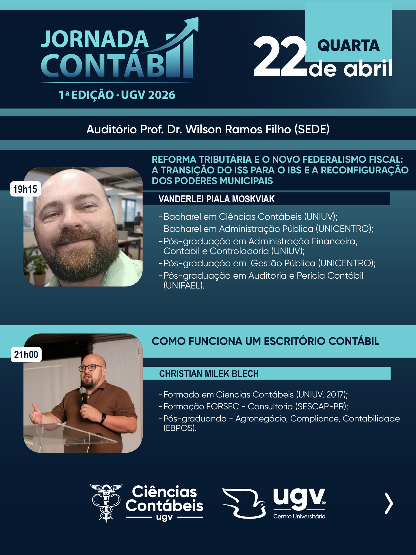 A Jornada Contábil da UGV – Centro Universitário, realizada entre os dias 22 e 24 de abril de 2026, proporcionou aos acadêmicos do curso de Ciências Contábeis uma programação rica em conhecimento, troca de experiências e conexão com as demandas atuais do mercado. O evento reuniu profissionais da área e promoveu momentos de aprendizado que reforçam a importância da formação alinhada às transformações da profissão.