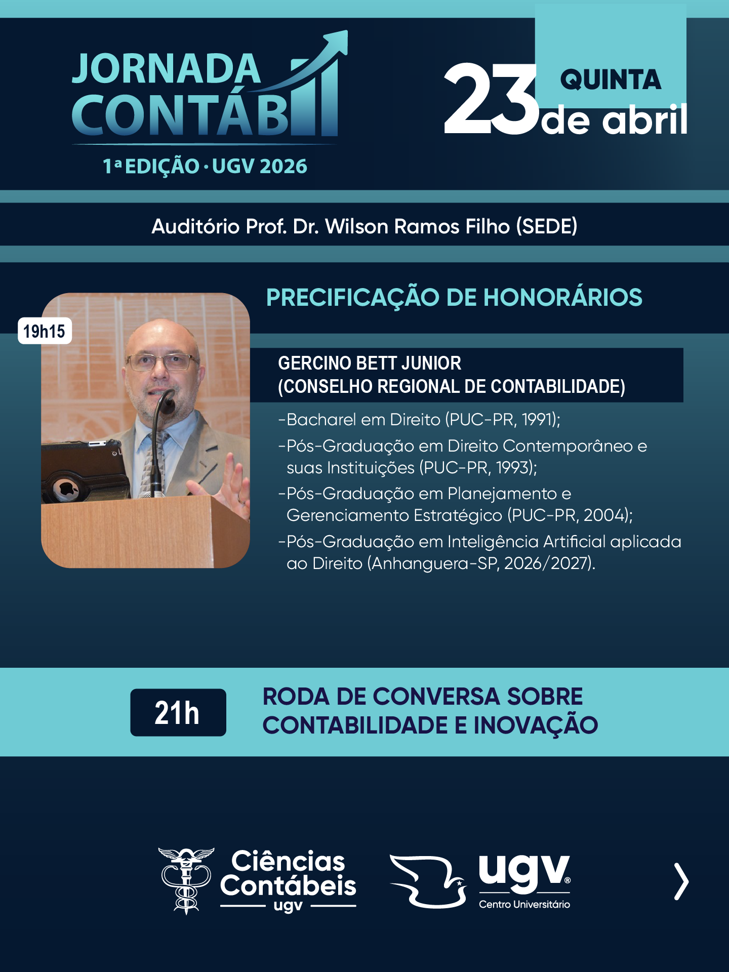 Mais do que um evento acadêmico, a Jornada Contábil da UGV reafirma o compromisso da instituição em oferecer uma formação completa, conectada às transformações do mercado e às exigências da profissão, preparando seus acadêmicos para atuarem com excelência, visão estratégica e responsabilidade.