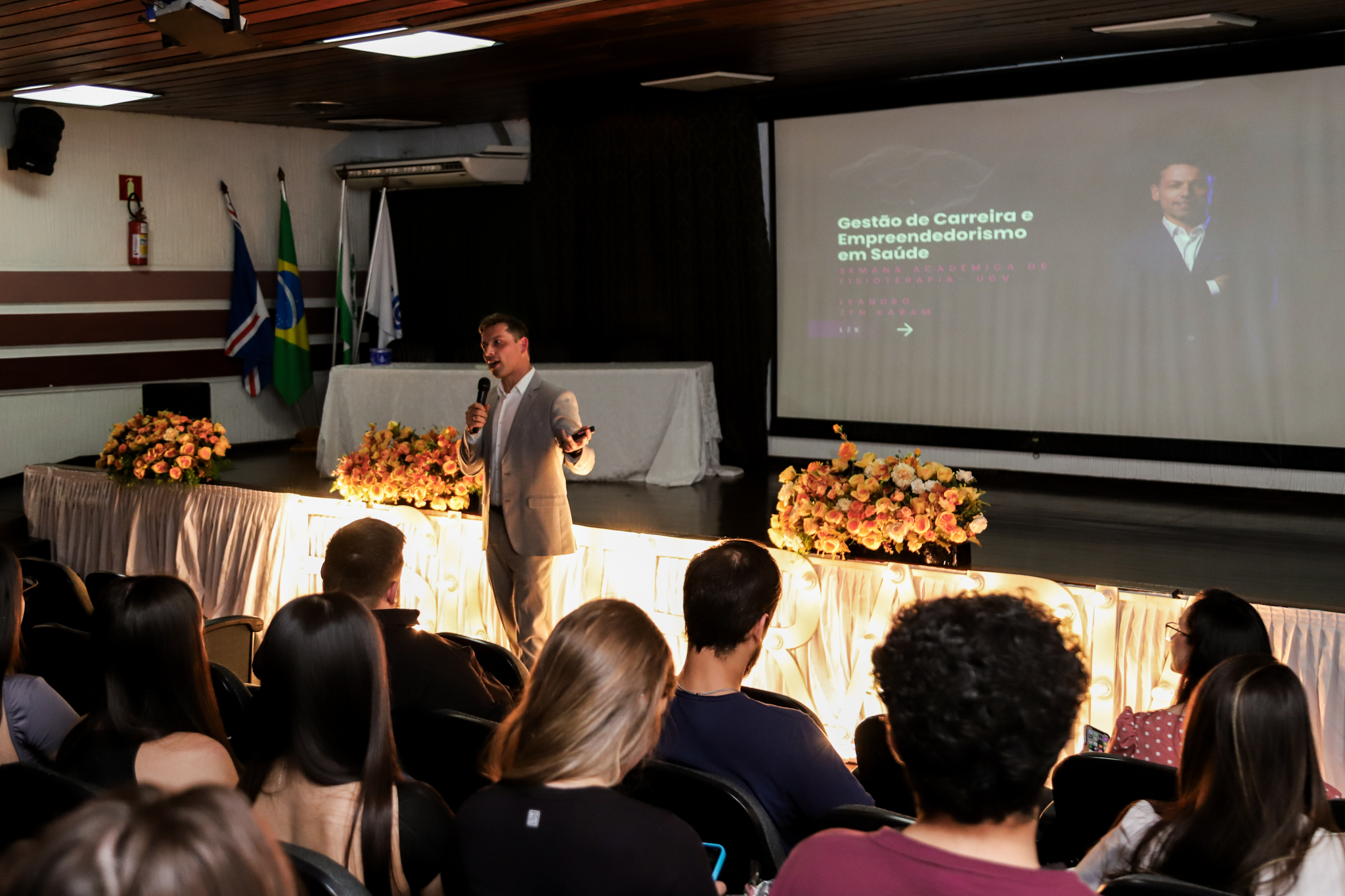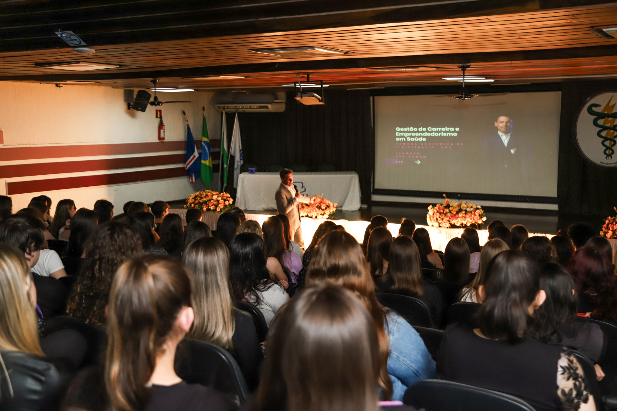 A abertura da semana aconteceu no Auditório Prof. Dr. Wilson Ramos Filho, com duas palestras que provocaram reflexões sobre o futuro da profissão. A primeira, ministrada por Leandro Zen Karan, teve como tema “Gestão de Carreira e Empreendedorismo em Saúde”. Leandro é diretor pedagógico da Escola de Medicina e Ciências da Vida da PUCPR, professor da Harvard Medical School e fundador da rede de clínicas Aloha Recovery. Em sua fala, compartilhou sua trajetória e os desafios de empreender na área da saúde, reforçando a importância da visão estratégica e da liderança para fisioterapeutas que desejam inovar em suas carreiras.