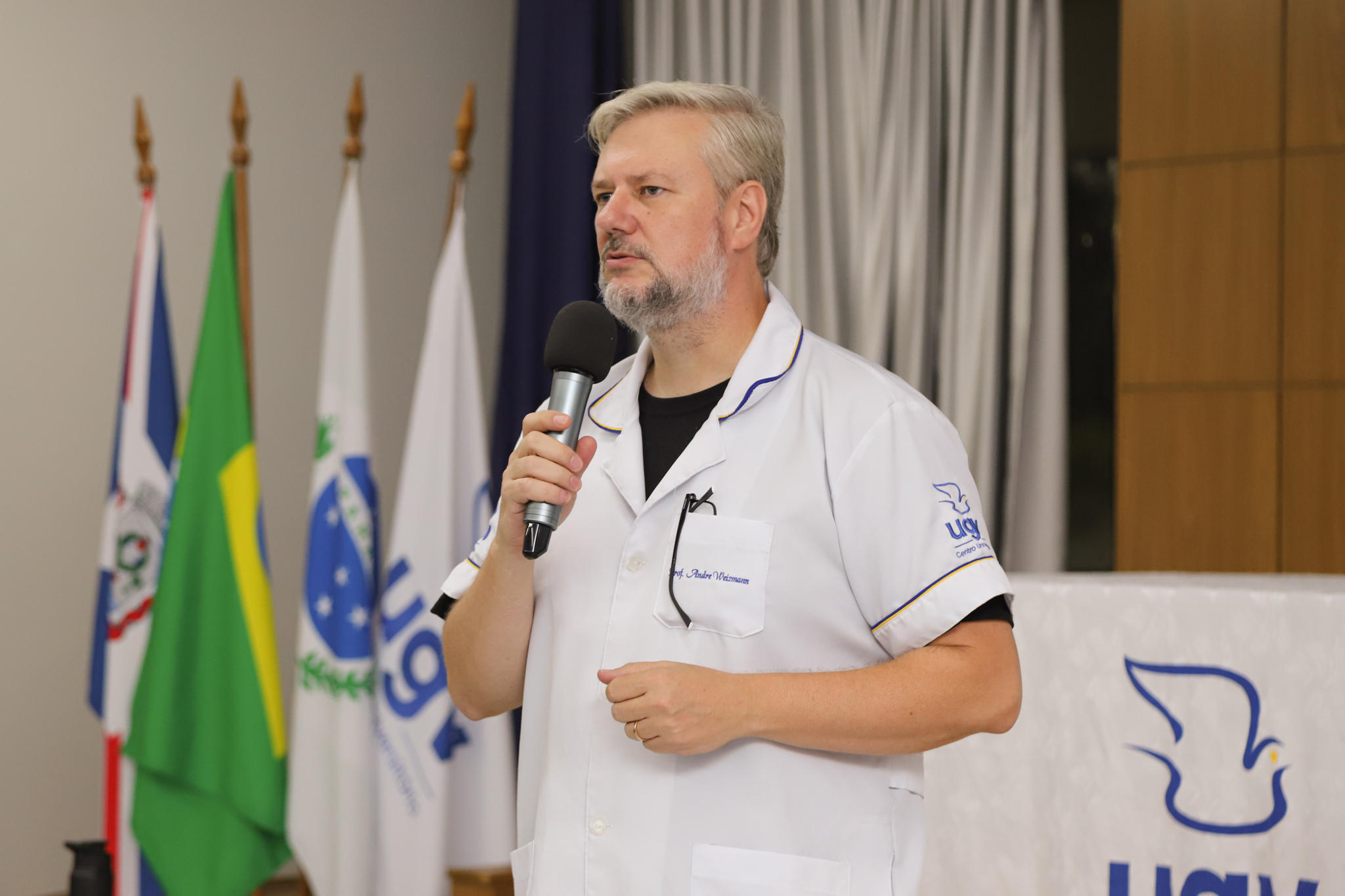 Na sequência, o coordenador do curso, professor André Weizmann, apresentou os dados da Avaliação Institucional referentes ao segundo semestre de 2025, conduzida pela Comissão Própria de Avaliação (CPA), destacando a importância do envolvimento dos acadêmicos no processo avaliativo.